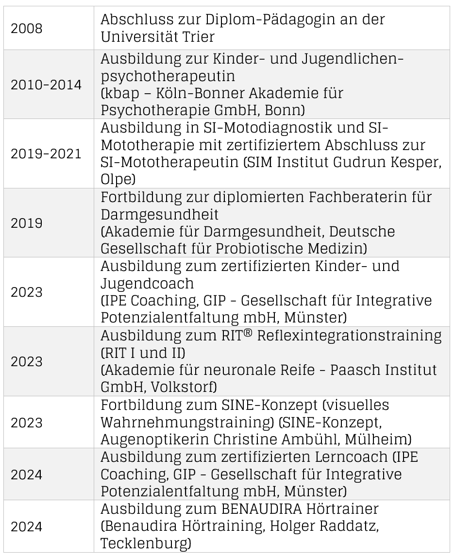 Wenn Sie Fragen dazu haben oder unsicher sind, ob die Probleme Ihres Kindes oder Jugendlichen mit noch aktiven frühkindlichen Reflexen zu tun haben könnten, melden Sie sich gerne bei mir für ein kostenloses telefonisches Erstgespräch. Ich kann individuell mit Ihnen schauen, ob die Reflexintegration eine hilfreiche Methode für Ihr Kind sein kann.
